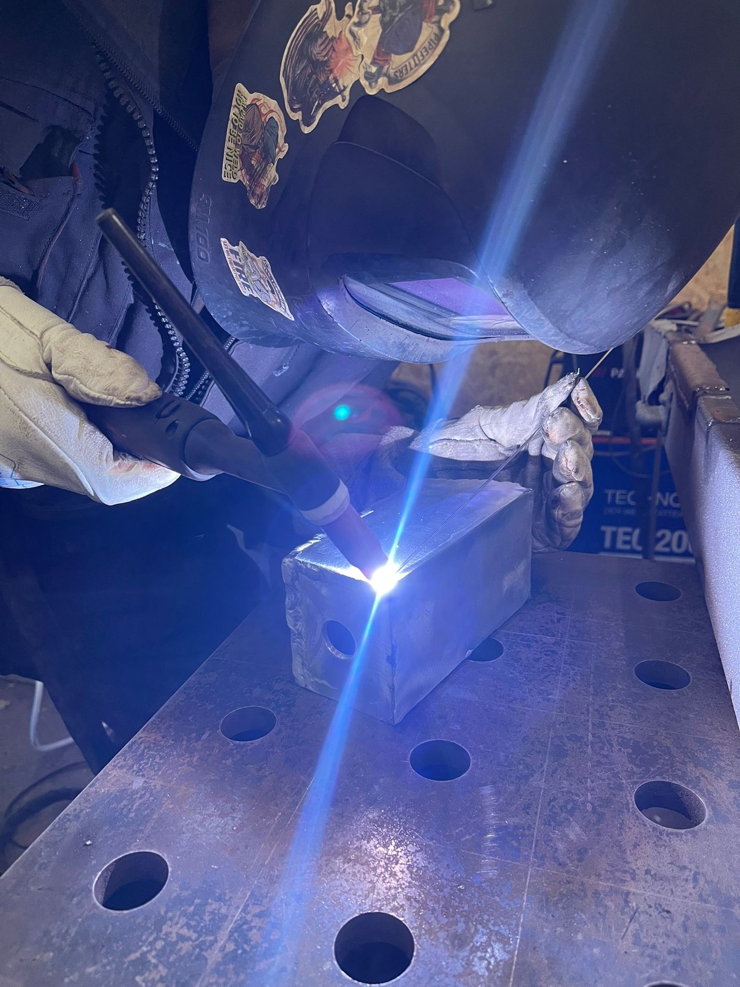 Jannik mit Schweißhelm beim WIG-Schweißen